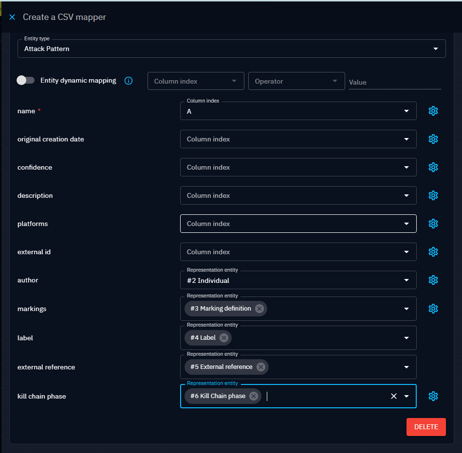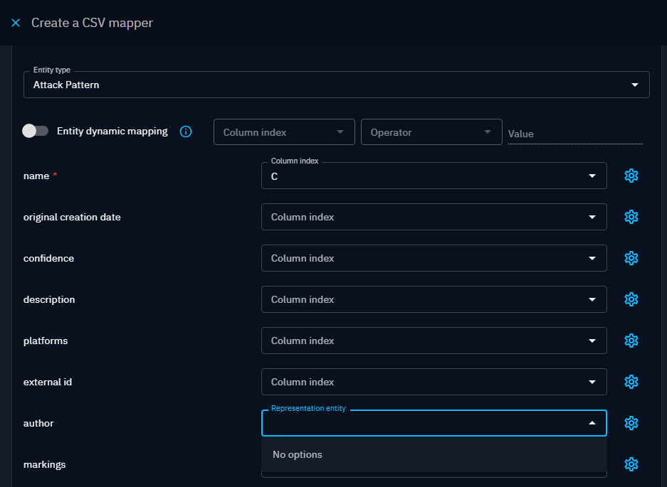 Reference attributes like author, markings, label, external references or kill chain phase, are modeled in the platform as entities. As such, they should be extracted from the CSV files through new entity representations in the mapper.