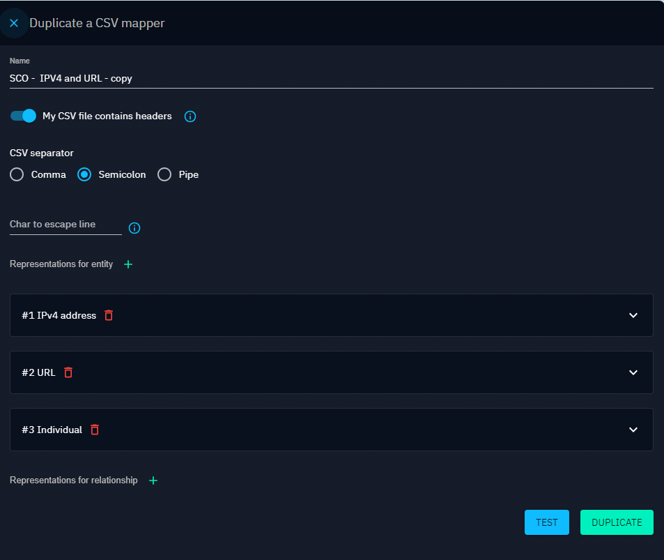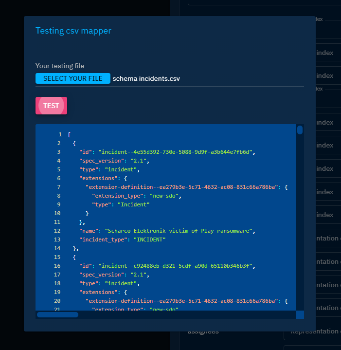 The test conducted in this window relies only on the translation of CSV data according to the chosen representation in the mapper. It does not take into account checks for accurate entity formatting (e.g. IPv4) or specific entity configurations (e.g. mandatory "description" field on reports). Consequently, the entities visible in the test window may not be created during the actual import process.