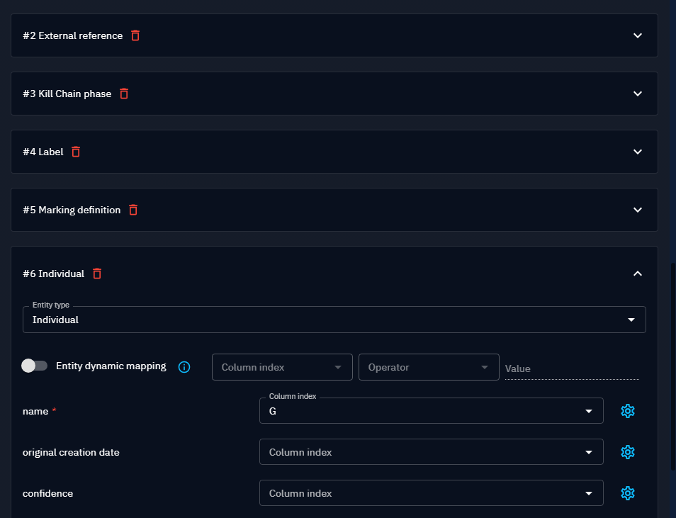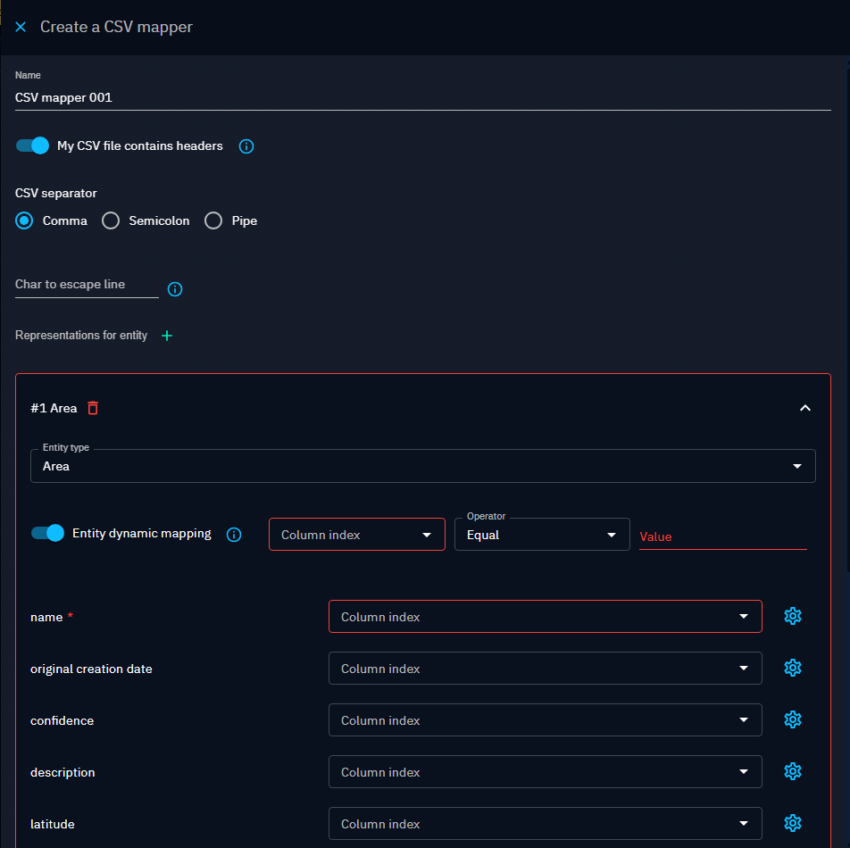 Depending on the entity type, the form contains the fields that are either required (input outlined in red) or optional. For each field, set the corresponding columns mapping (the letter-based index of the column in the CSV table, as presented in common spreadsheet tools).