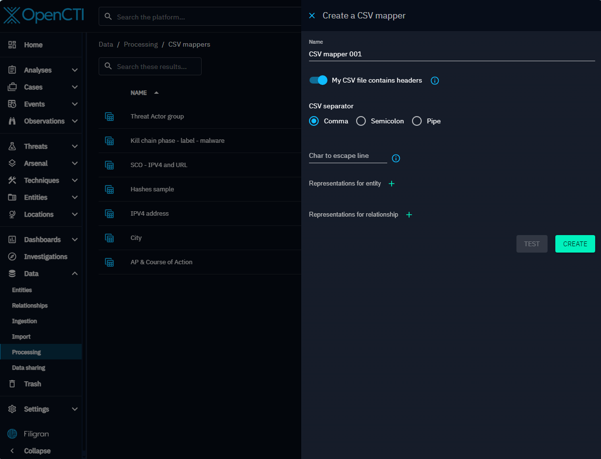 In OpenCTI, CSV Mappers allow to parse CSV files in a STIX 2.1 Object. The mappers are created and configured by users with the Manage data mappers capability. Then, they are available to users who import CSV files, for instance inside a report or in the global import view.