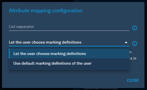 - Let the user choose marking definitions. Here the user importing the CSV file will choose marking definitions (among the ones they can see) when selecting the CSV mapper.