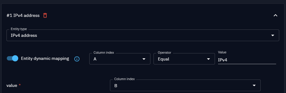 If your CSV file contains multiple entities in separate rows but in the same columns, you can enable "Entity dynamic mapping". Click the toggle button to activate it. You must then specify the following: