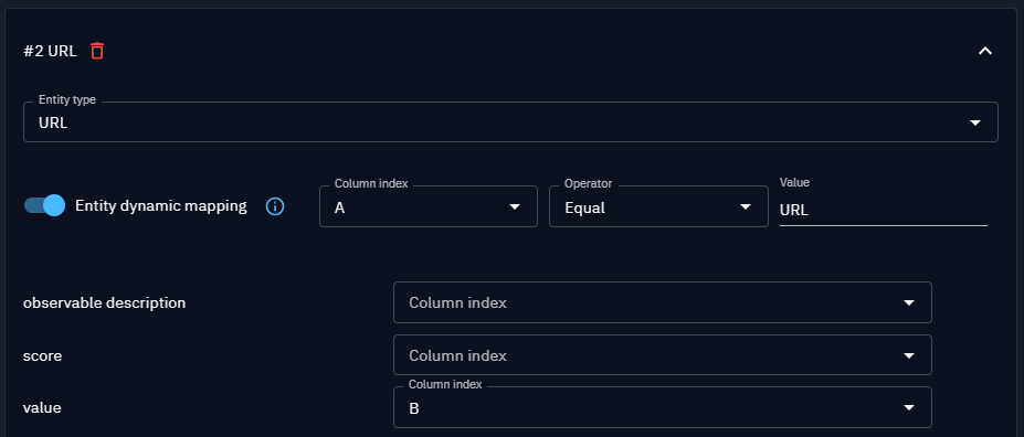 set 2 representatives for IPv4 and URL entities, with dynamic mapping depending on the content of column A ; column B being used in both representatives as the observable value.
