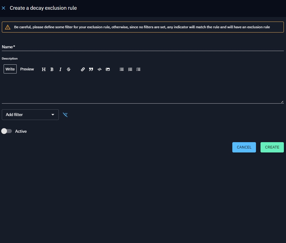 - Do not create a decay exclusion rule without filters: it will impact all your IOCs.