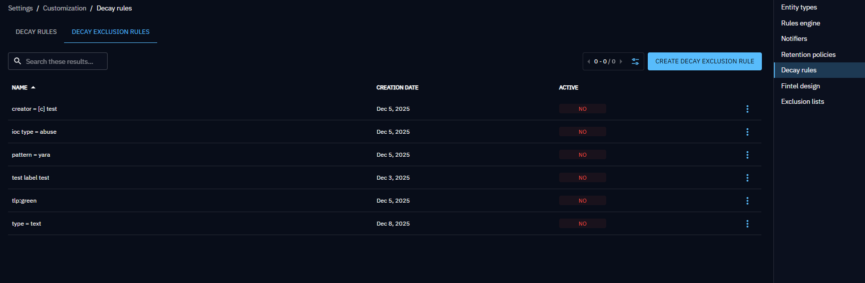 Decay exclusion rules can be configured in the "Settings > Customization > Decay rule" menu. This screen contains two tabs: decay rules & decay exclusion rules.