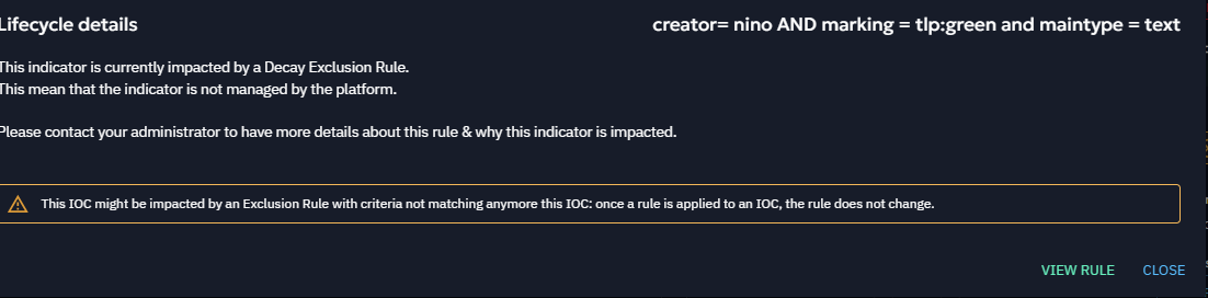 If you have the right, you can even view the rule name & be redirected to the screen of decay exclusion rule, to help you understand (and manage) which rule is impacting which IOC.