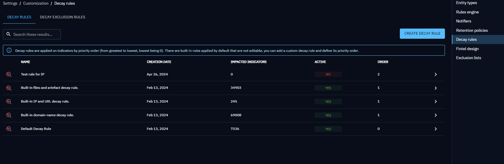 There are built-in decay rules that can't be modified and are applied by default to indicators depending on their main observable type. Decay rules are applied from highest to lowest order (the lowest being 0).