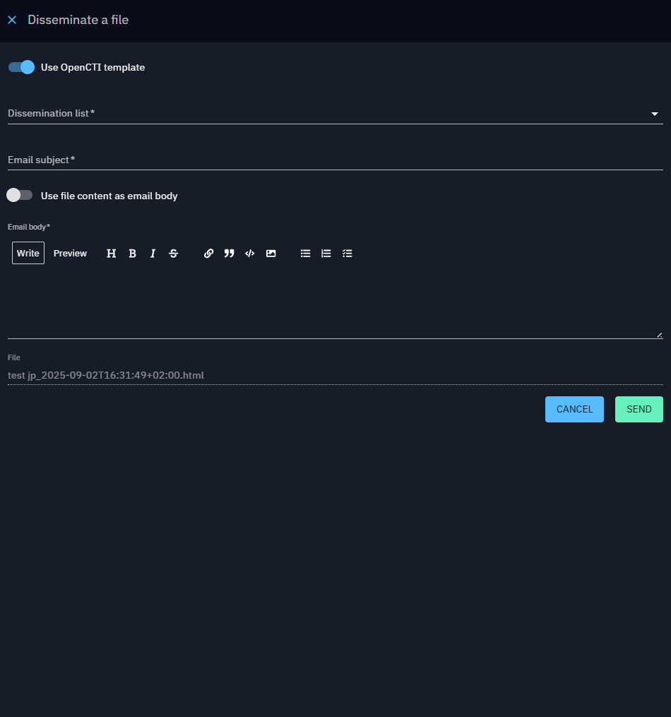 Use OpenCTI template By default enabled. This option allows you to decide whether or not you want to use the OpenCTI look and feel within your email, or if you would rather use an email without a predefined style. This option is specifically useful if you would like to send the content of your finished intelligence document directly as an email body, without additional formatting.