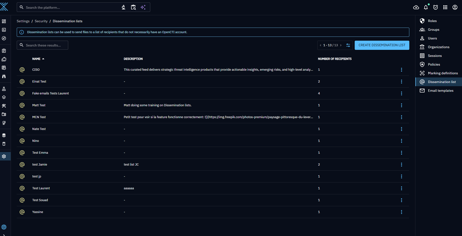 Dissemination list in OpenCTI aims to help you create mailing lists that are used to send (disseminate) finished intelligence.