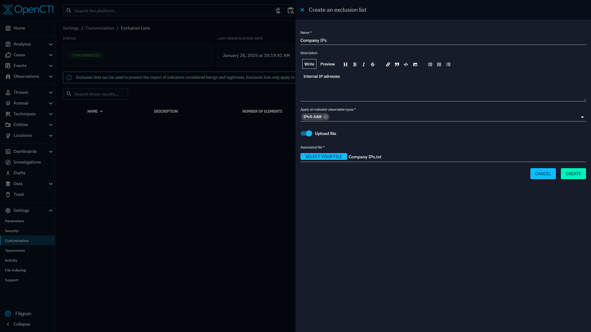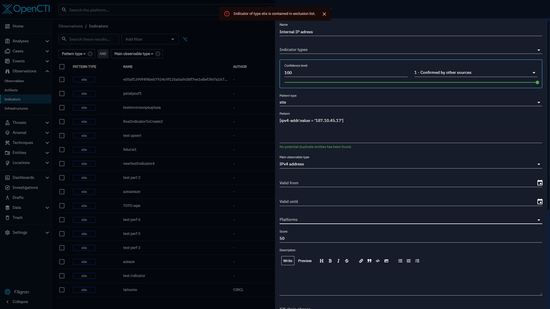 From now on, when an indicator is about to be created, if its pattern contains an observable value belonging to an exclusion list, then this indicator will not be created, with an error message of Indicator of type stix is contained in exclusion list.