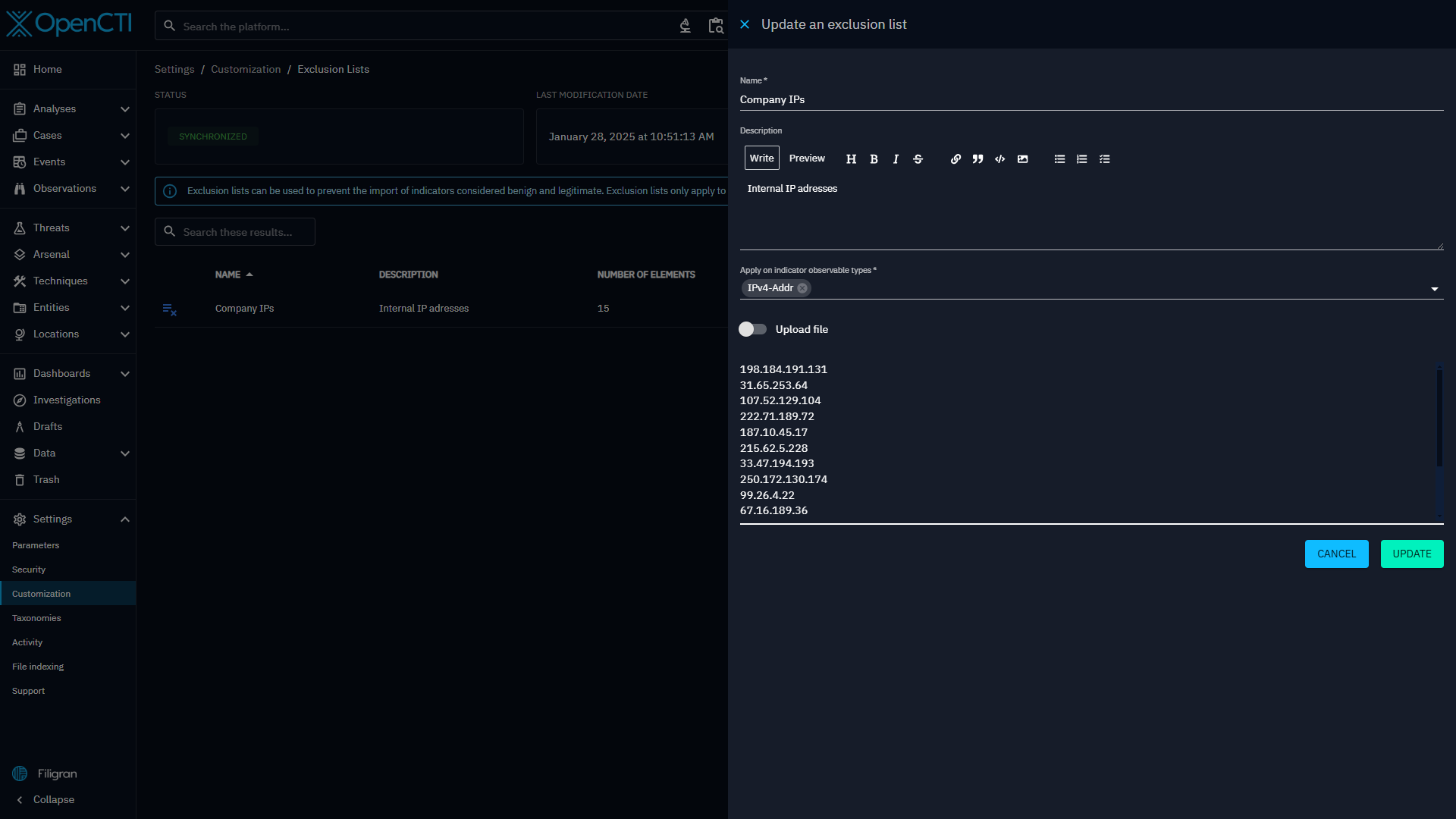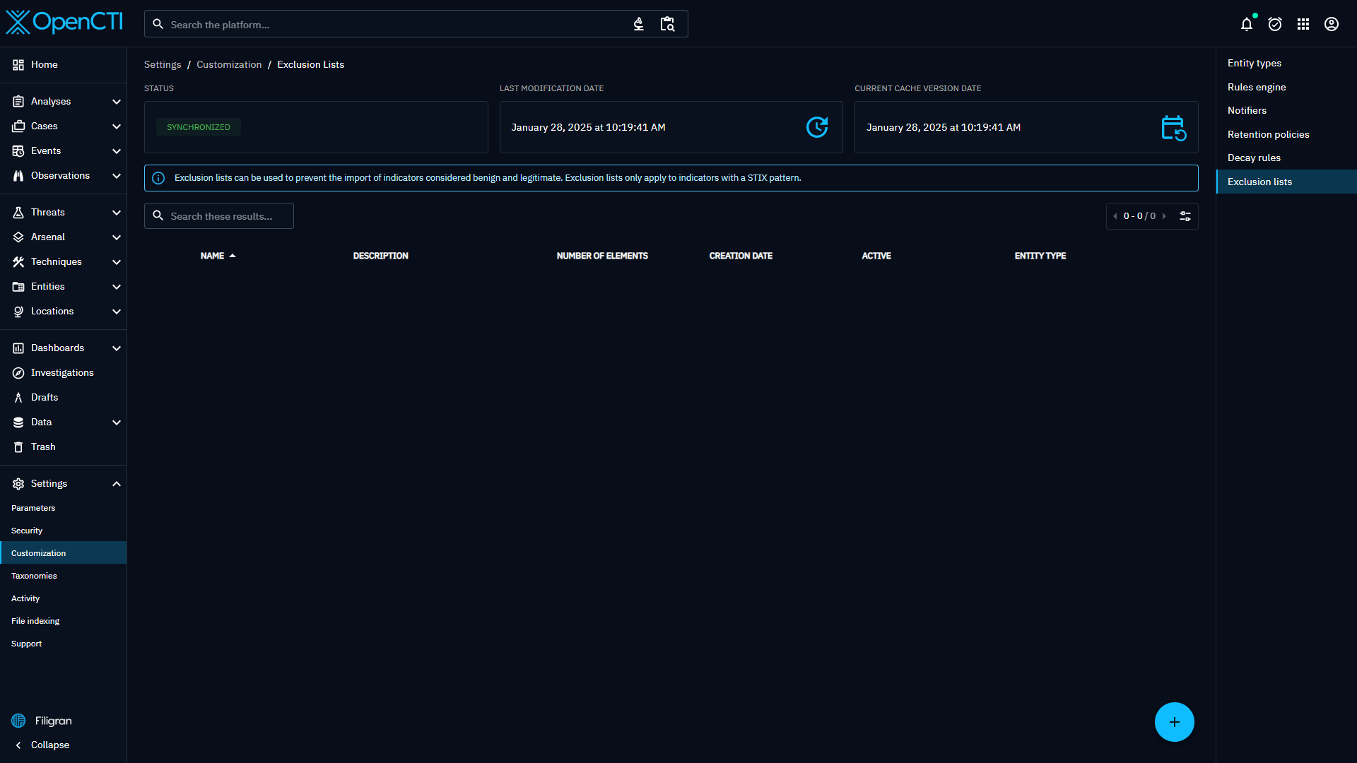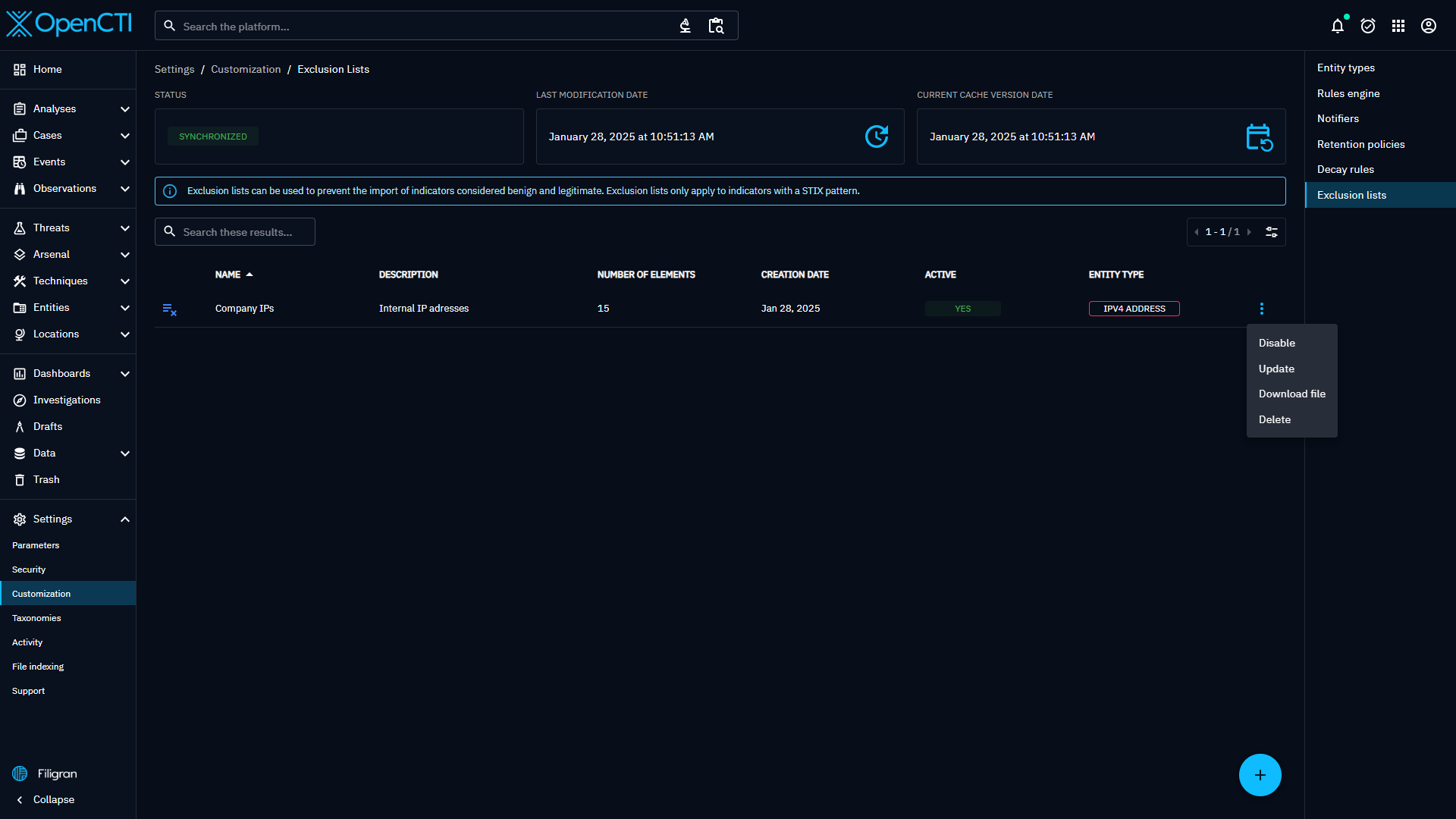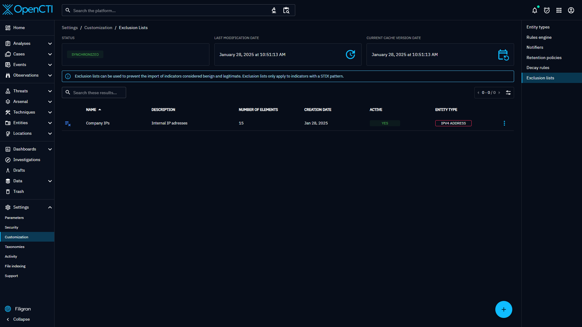 - Indicator observable types : this corresponds to the contents of the exclusion list