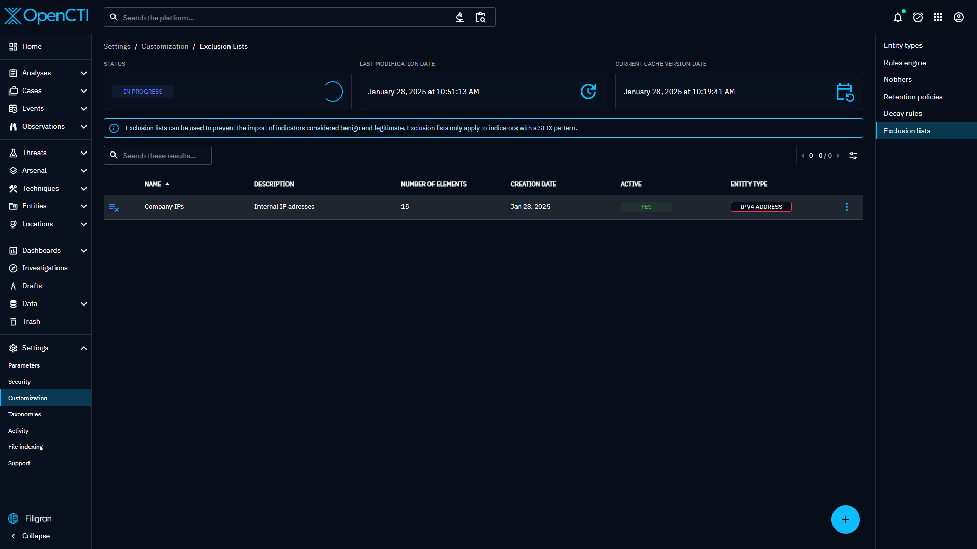 Once created, you can see that the status is In progress and that the Last modification date has changed. This is because the new exclusion list has been created, but still need to be propagated to all of the platform nodes.