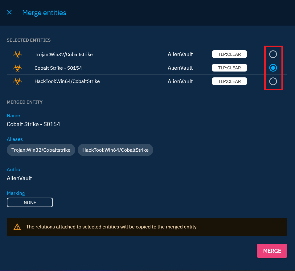 A common concern when merging entities lies in the potential loss of information. In the context of OpenCTI, this worry is alleviated. Even if the merged entities were initially created by distinct sources, the platform ensures that data is not lost. Upon merging, the platform automatically generates relationships directly on the merged entity. This strategic approach ensures that all connections, regardless of their origin, are anchored to the consolidated entity. Post-merge, OpenCTI treats these once-separate entities as a singular, unified entity. Subsequent information from varied sources is channeled directly into the entity resulting from the merger. This unified entity becomes the focal point for all future relationships, ensuring the continuity of data and relationships without any loss or fragmentation.