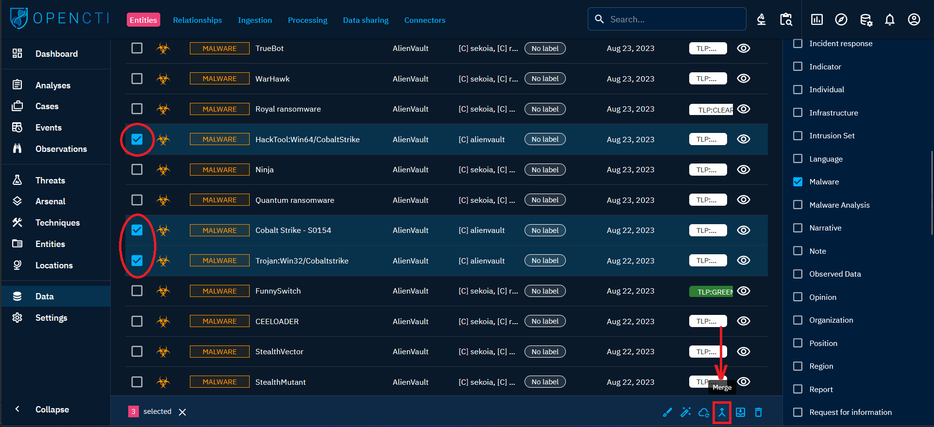 Within the OpenCTI platform, the merge capability is present into the "Data > Entities" tab, and is fairly straightforward to use. To execute a merge, select the set of entities to be merged, then click on the Merge icon.