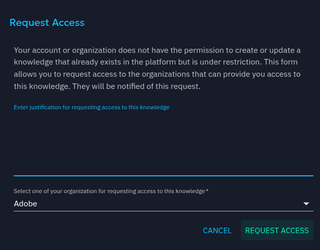 Once the configuration is complete, user that attempt to create an existing knowledge will have a new button "Request Access" proposed.
