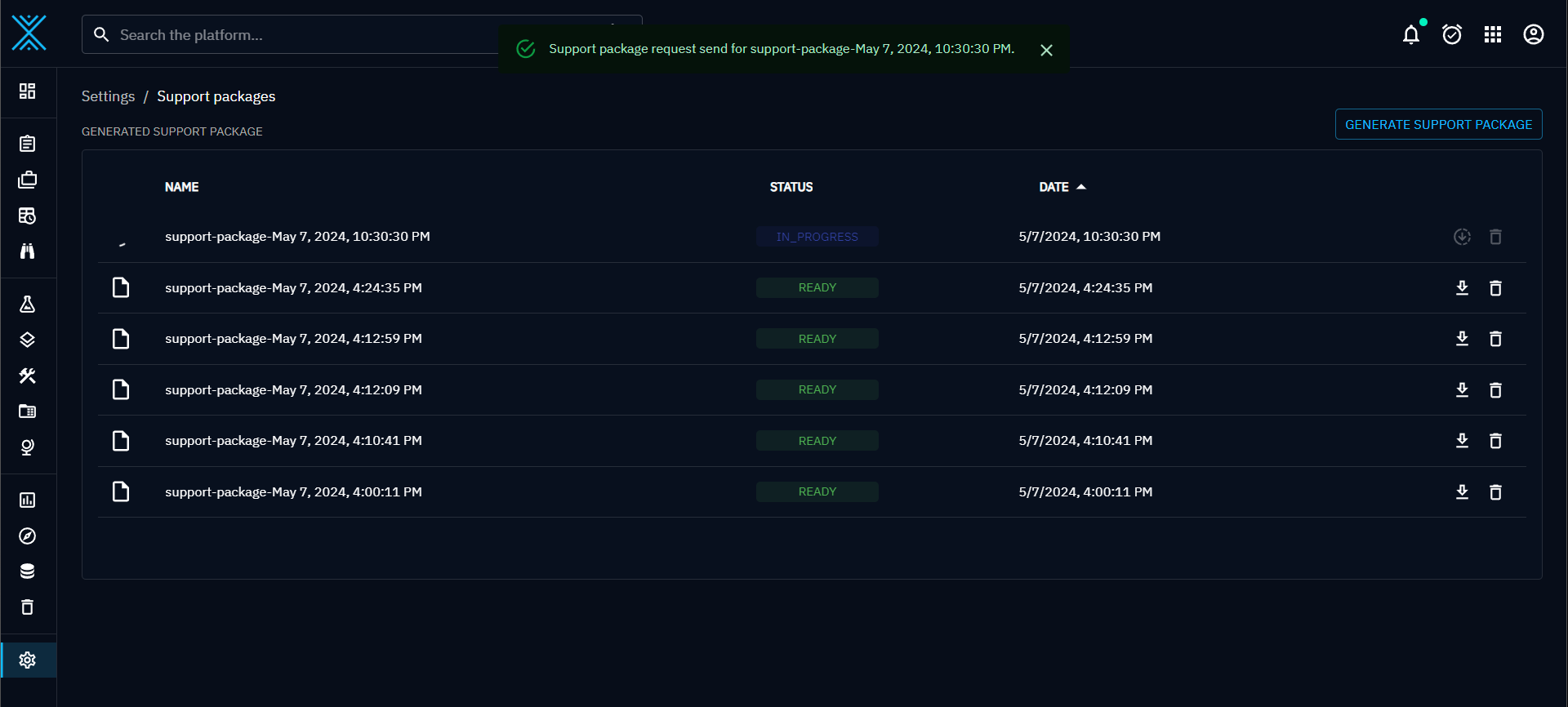 On a click on "Generate support package", a support event is propagated to every platform instances to request needed information. Every instance that will receive this message will process the request and send the files to the platform. During this processing the interface will display the expected support package name in an IN PROGRESS state waiting for completion. After finishing the process the support package will move to the READY state and the buttons download and delete will be activated.