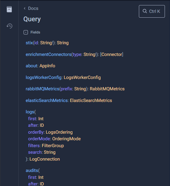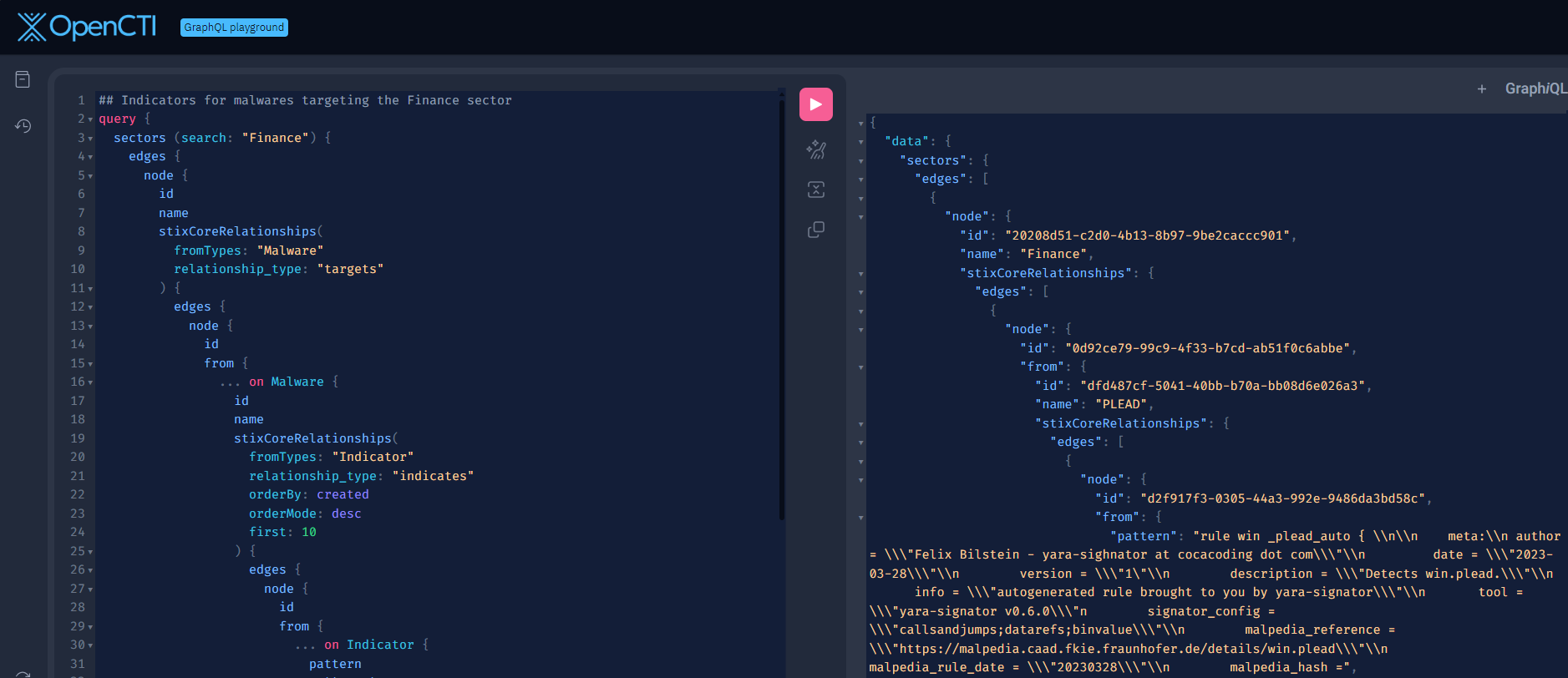 To allow analysts and developers to implement more custom or complex use cases, a full GraphQL API is available in the application on the /graphql endpoint.