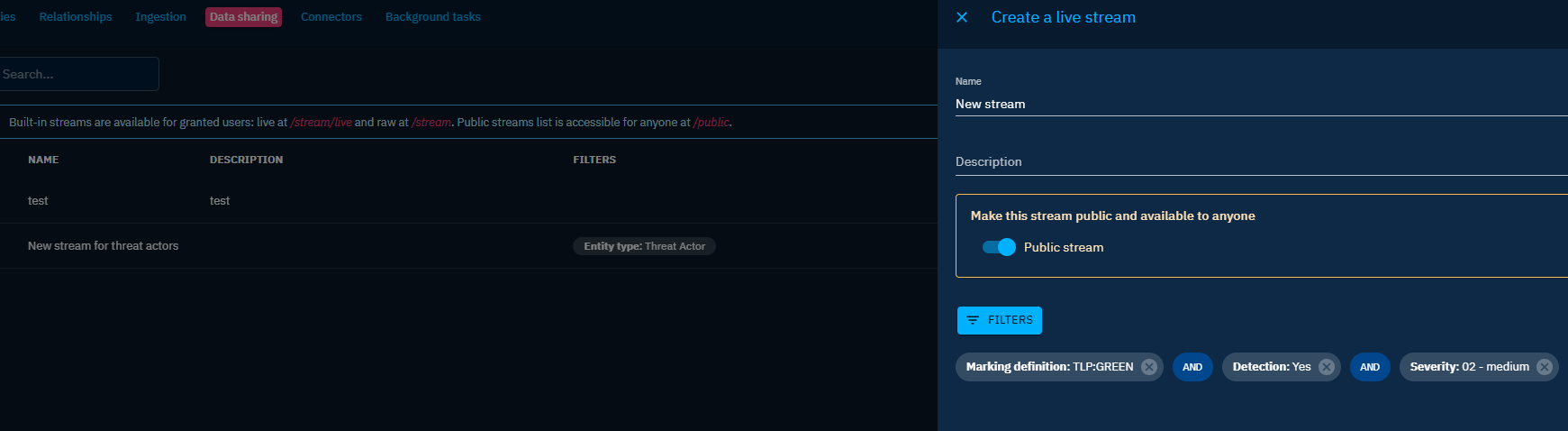 That's why we've developed the live streams. They are available in Data > Data sharing > Live streams. As with TAXII collections, it is possible to create as many streams as needed using filters.