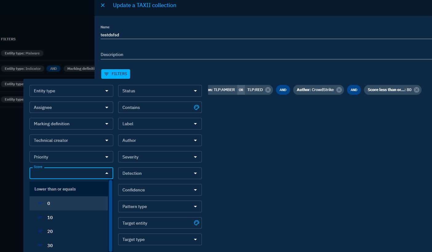 TAXII collections are a sub-selection of the knowledge available in the platform and rely on filters. For instance, it is possible to create TAXII collections for pieces of malware with a given label, for indicators with a score greater than n, etc.