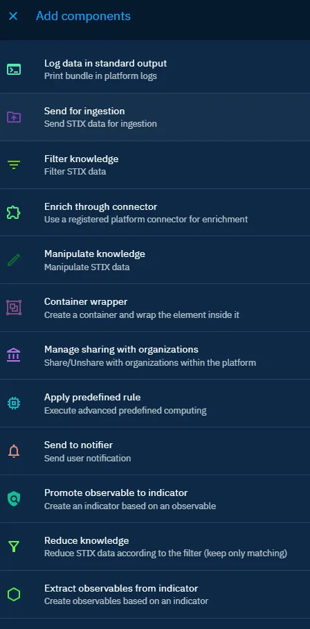 Initiating with a component listening to a data stream, each subsequent component in the playbook processes a received STIX bundle. These components have the ability to modify the bundle and subsequently transmit the altered result to connected components.