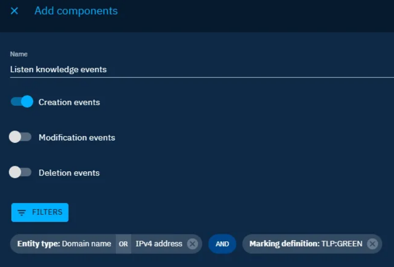 With this event source, the playbook will be triggered on any knowledge event (create, update or delete) that matches the selected filters. Note that you are limited to a subset of filters available for stream events that contain STIX data objects.