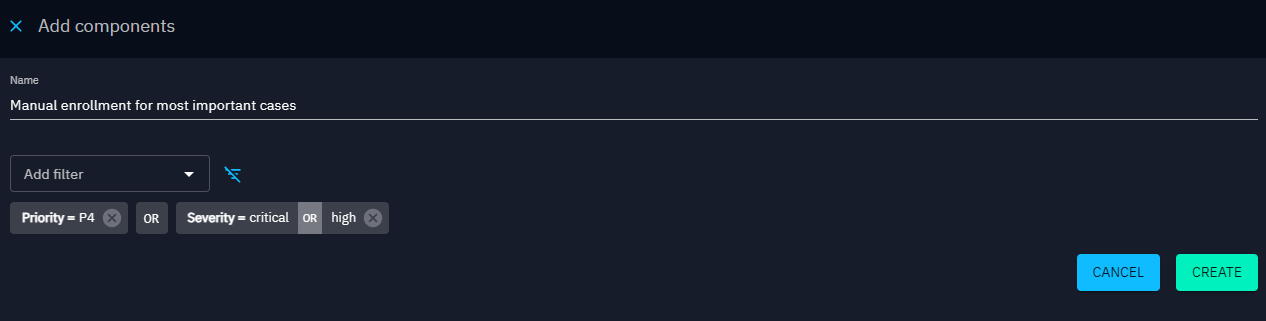 Use this event source for setting up a playbook that will be triggered manually on specific entities. You can configure filters in the component so that this playbook will be suggested for certain entities during the manual enrollment. For more details about manual enrollment, see dedicated section below.