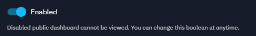 Then you can choose if the public dashboard is enabled or not. A disabled dashboard means that you cannot access the public dashboard through the custom URL. But you can still manage it from this panel.