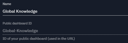 You need to specify a name for your public dashboard. This name will be displayed on the dashboard page. The name is also used to generate an ID for your public dashboard that will be used in the URL to access the dashboard.