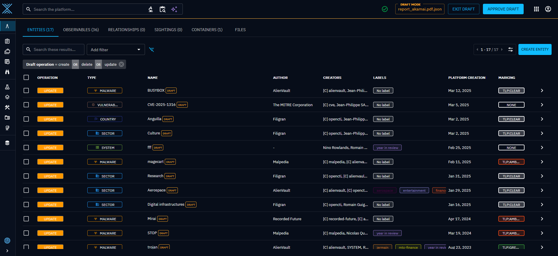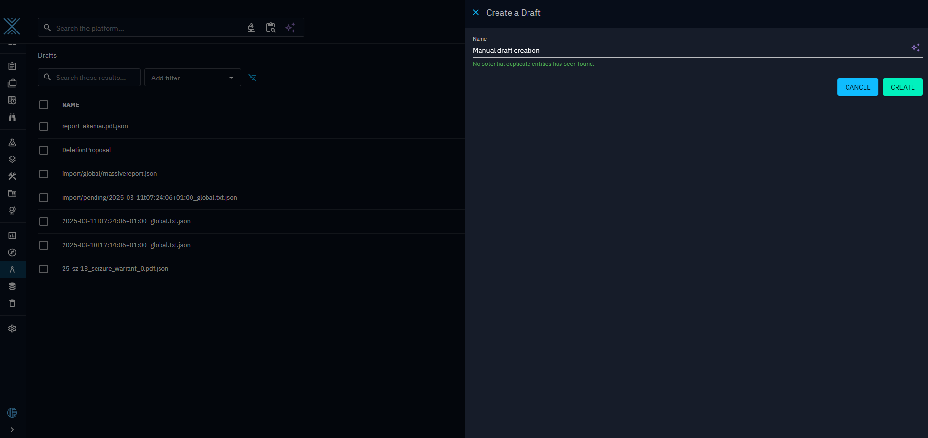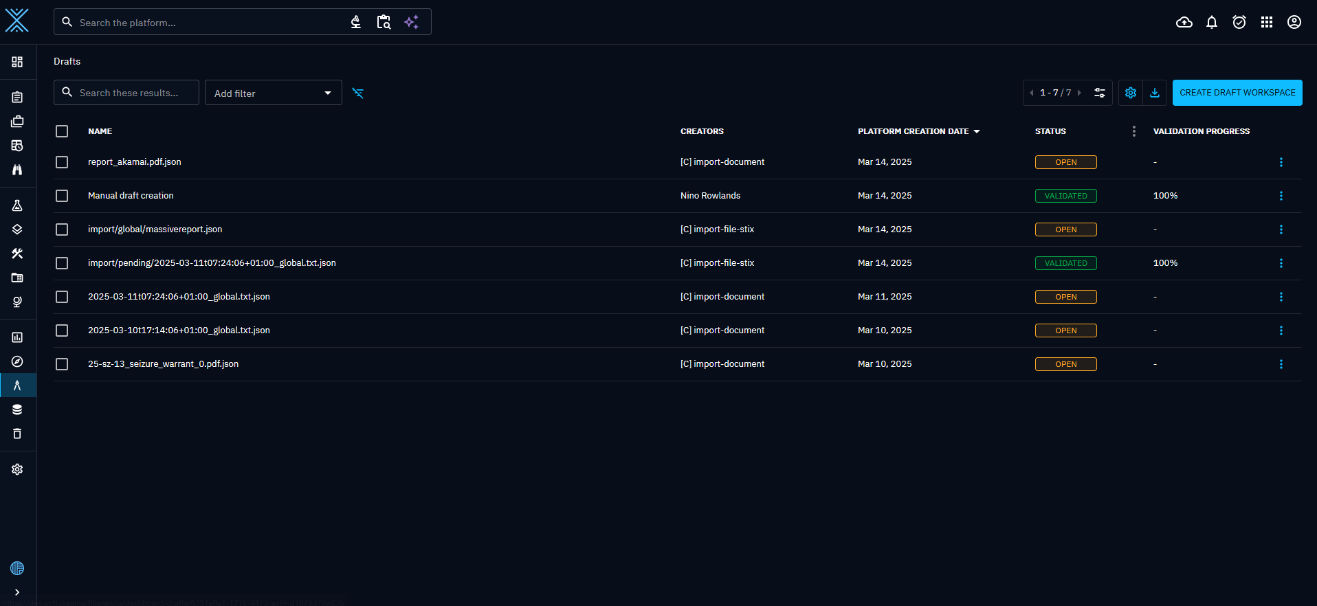 Drafts are powerful tools that enable analysts to create and manipulate data in a separate workspace, without impacting the main knowledge base of the platform. Most of the feature available in the platform are also compatible in draft.