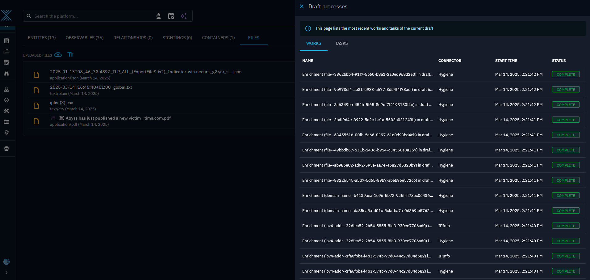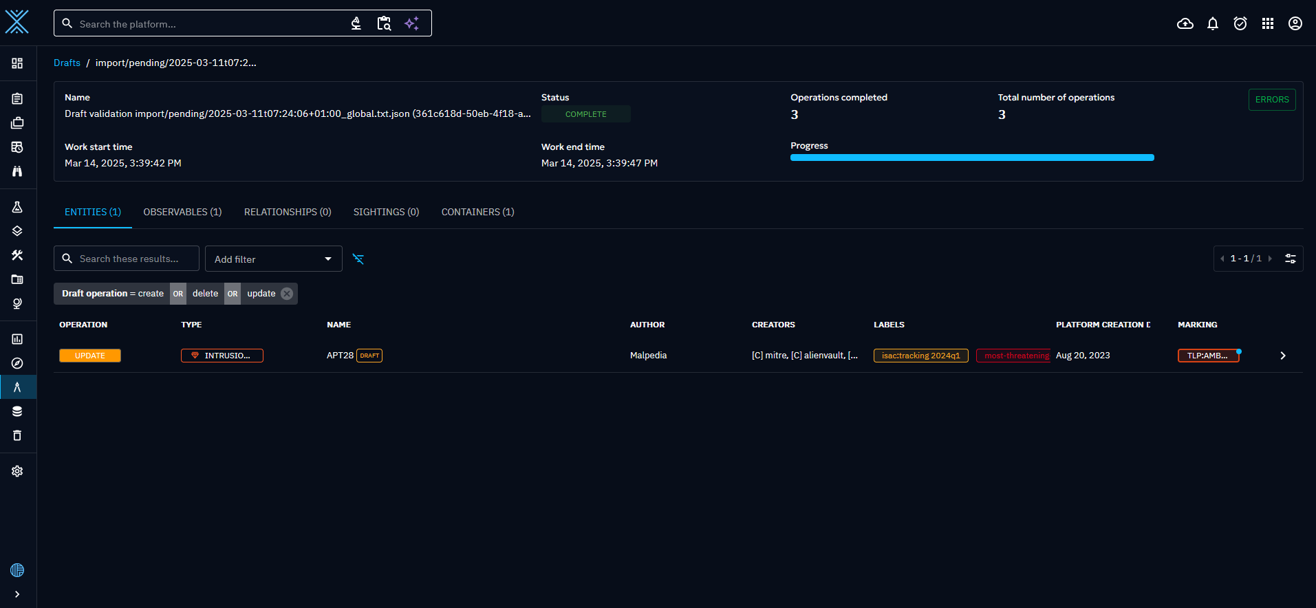 This overview is separated into different tabs: entities, observables, relationships, sightings and containers. Each tab contains the list of the modifications applied to an item of this type.