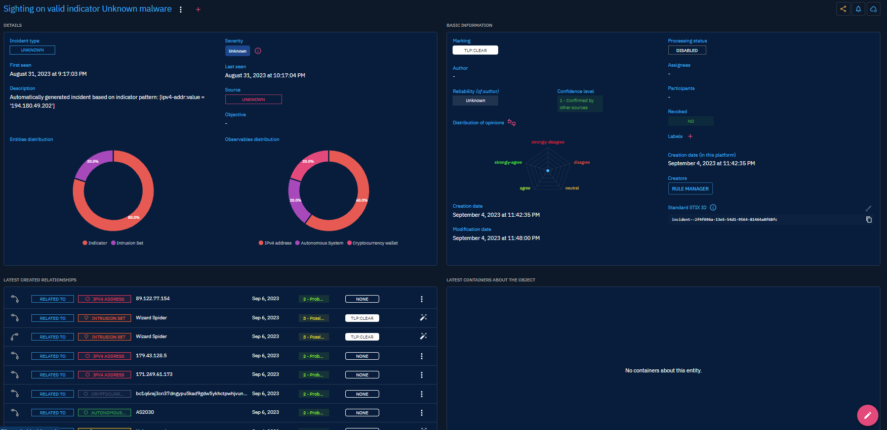 - Overview: as described here, with the particularity to display two distribution graphs of its related Entities (STIX SDO) and Observable (STIX SCO).