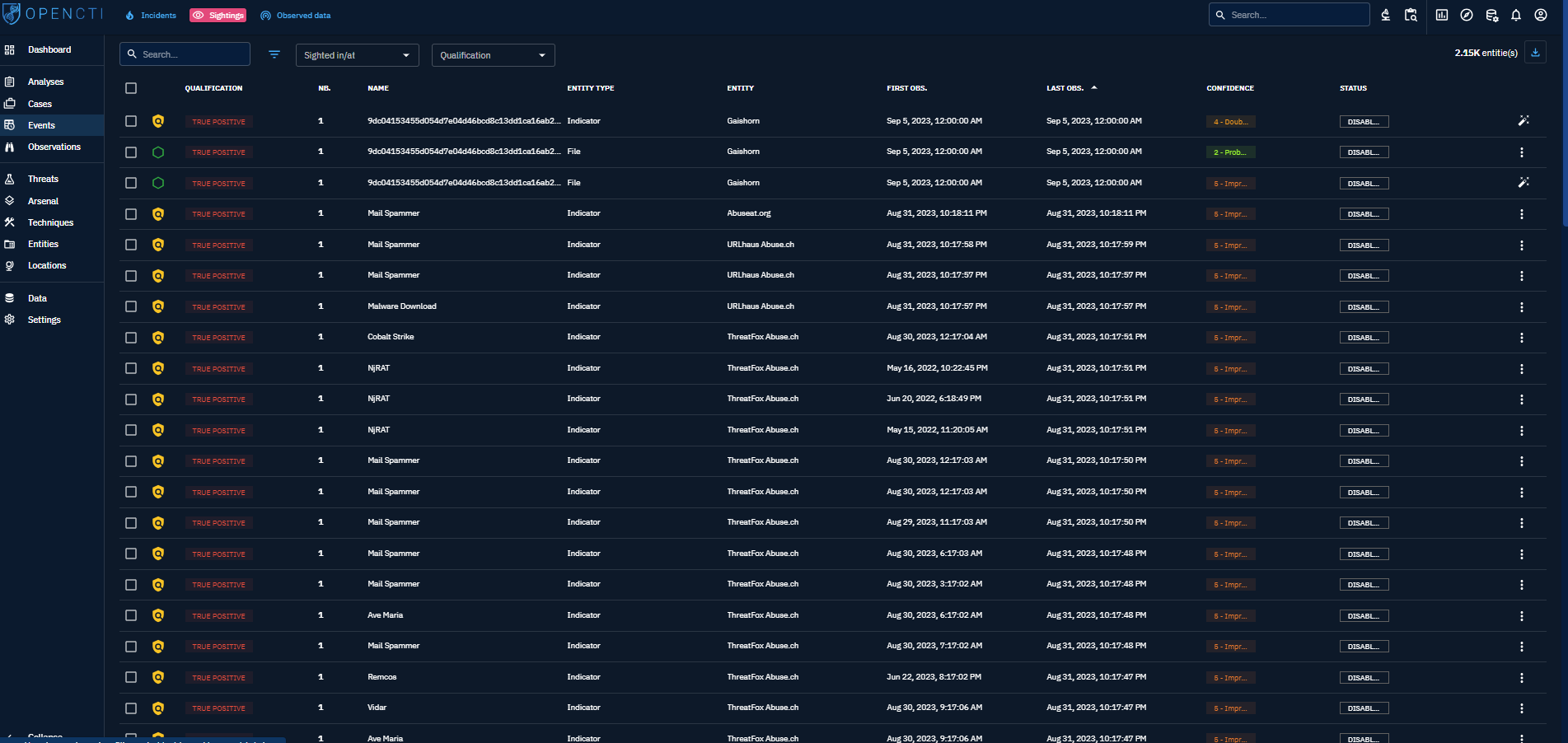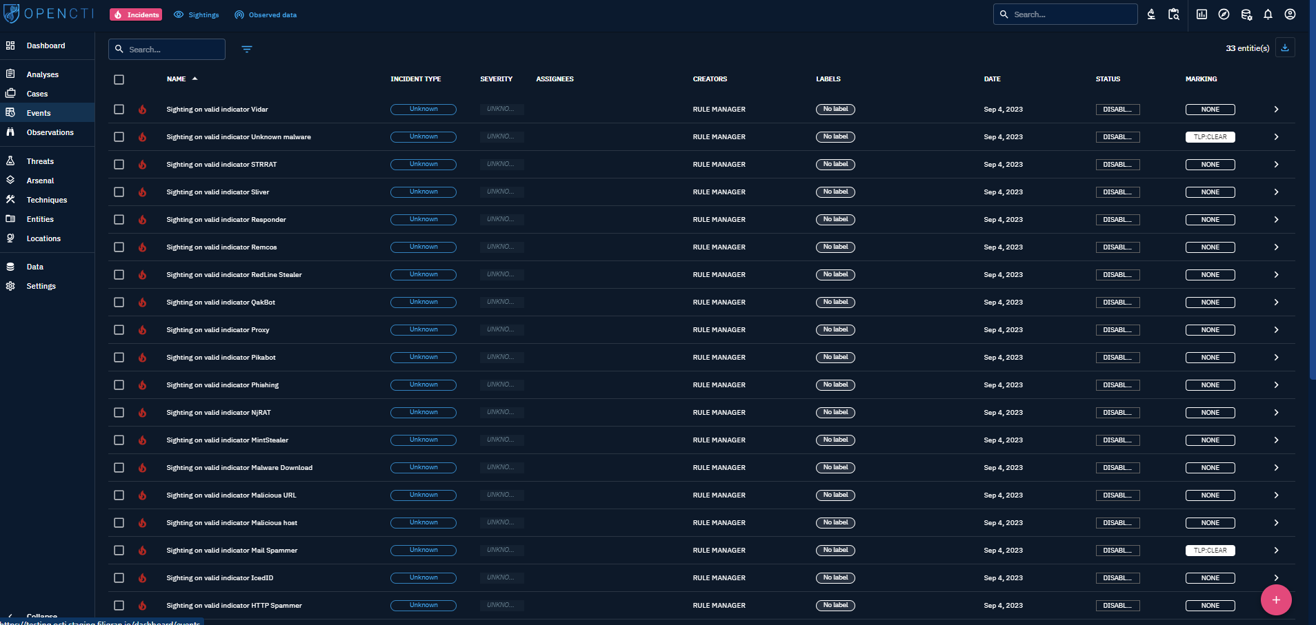 Incidents: In OpenCTI,Incidentscorrespond to a negative event happening on an information system. This can include a cyberattack (intrusion, phishing, etc.), a consolidated security alert generated by a SIEM or EDR that need to be qualified, and so on. It can also refer to an information warfare attack in the context of countering disinformation.Sightings:Sightingscorrespond to the event in which anObservable(IP, domain name, certificate, etc.) is detected by or within an information system, an individual or an organization. Most often, this corresponds to a security event transmitted by a SIEM or an EDR.Observed Data:Observed Datahas been added in OpenCTI by compliance with the STIX 2.1 standard. You can see it has a pseudo-container that contains Observables, like a line of firewall log for example. Currently, it is rarely used.