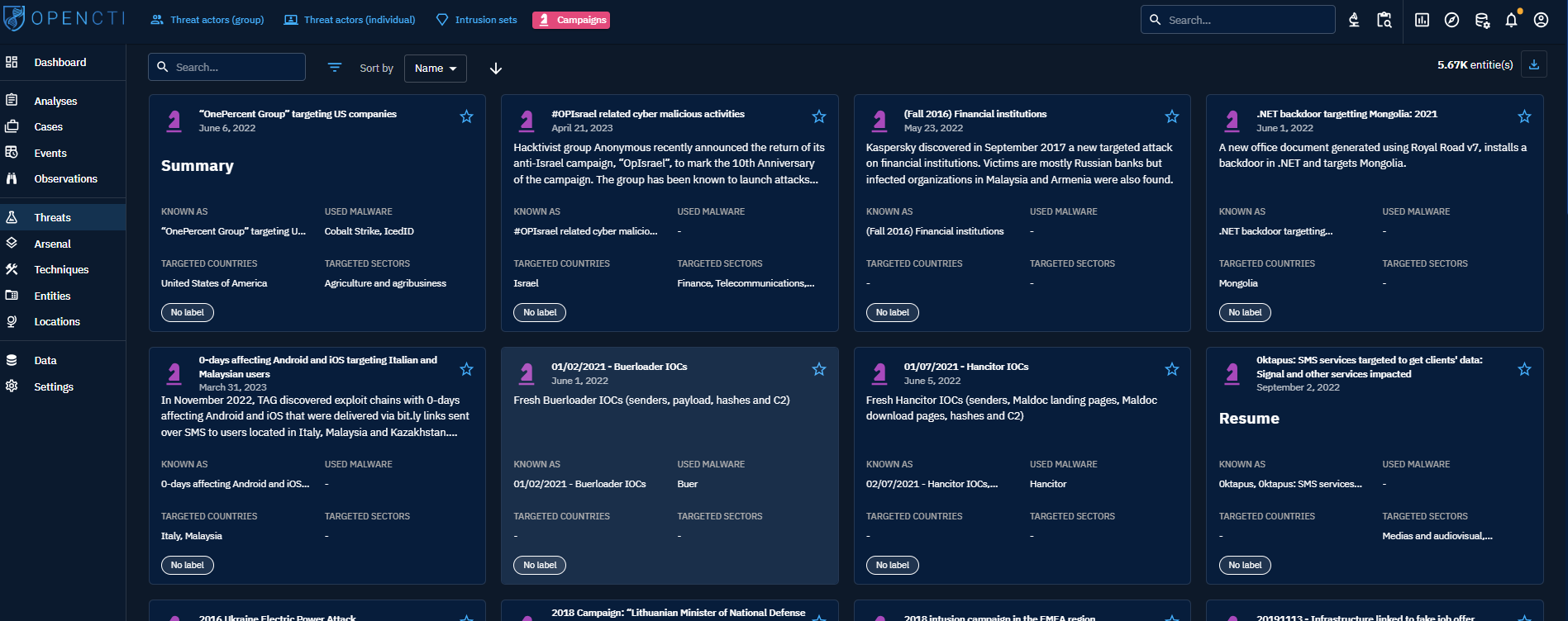 When clicking on the Campaign tab on the top left, you see the list of all the Campaigns you have access to, in respect with your allowed marking definitions. These campaigns are displayed as Cards where you can find a summary of the important Knowledge associated with each of them: description, aliases, malware used, countries and industries they target, labels. You can then search and filter on some common and specific attributes of Campaigns.