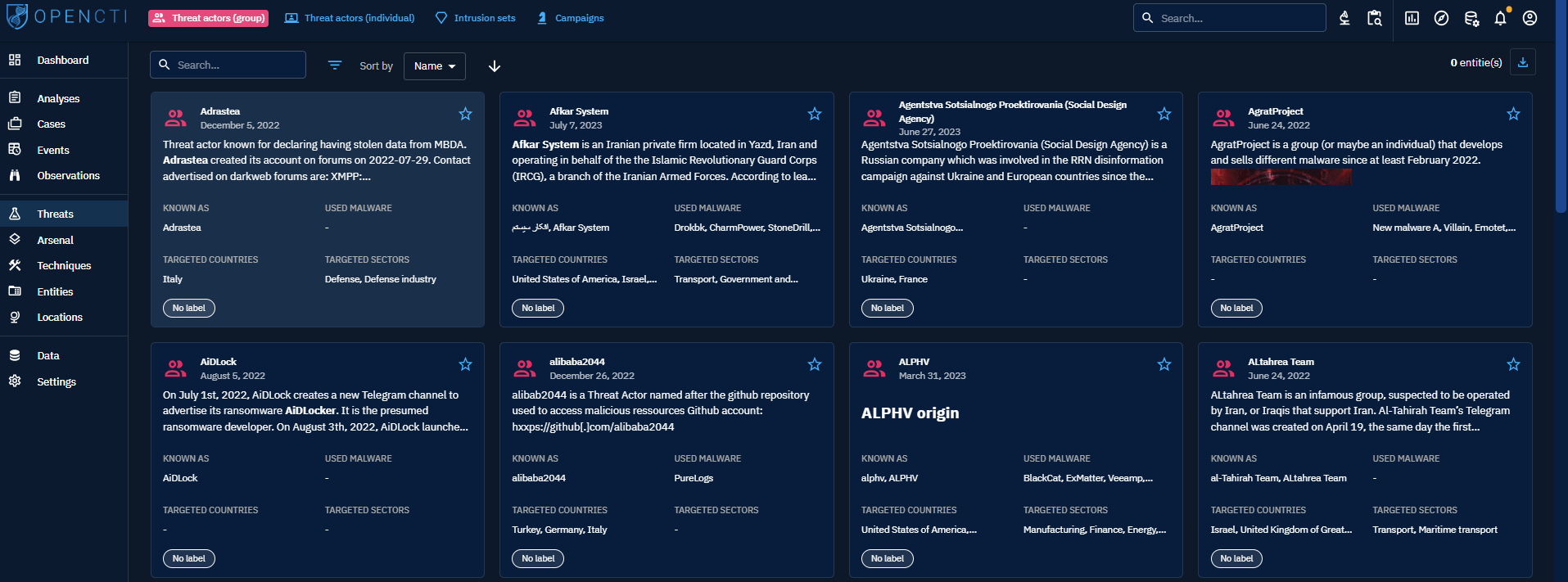 When you click on "Threats" in the left-side bar, you access all the "Threats" tabs, visible on the top bar on the left. By default, the user directly access the "Threat Actor (Group)" tab, but can navigate to the other tabs as well.