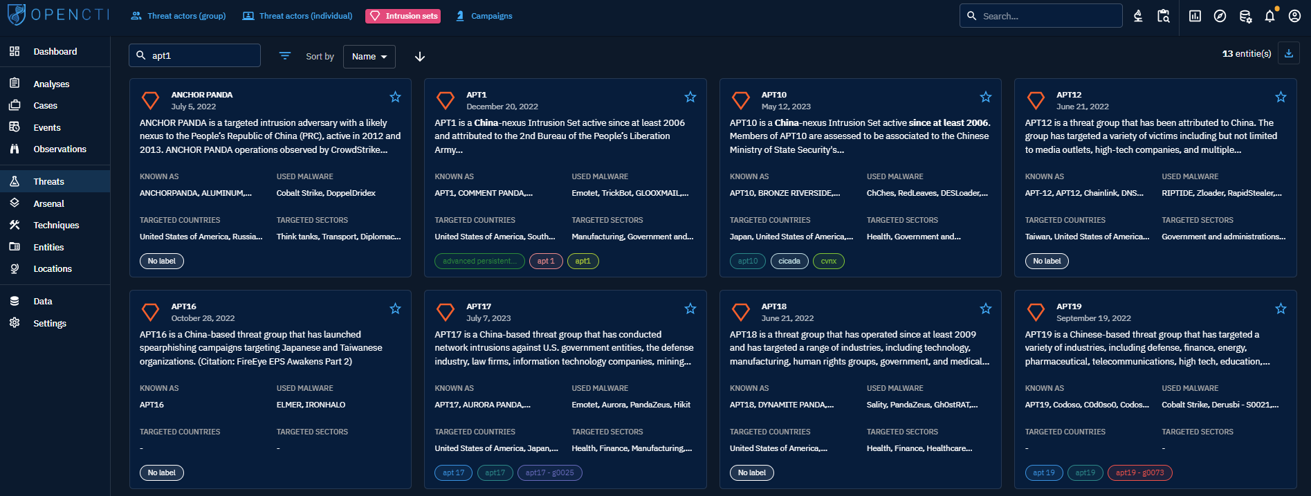 When clicking on the Intrusion set tab on the top left, you see the list of all the Intrusion sets you have access to, in respect with your allowed marking definitions. These intrusion sets are displayed as Cards where you can find a summary of the important Knowledge associated with each of them: description, aliases, malware they used, countries and industries they target, labels. You can then search and filter on some common and specific attributes of Intrusion set.