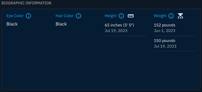 Biographic information includes their eye and hair color, as well as known heights and weights.