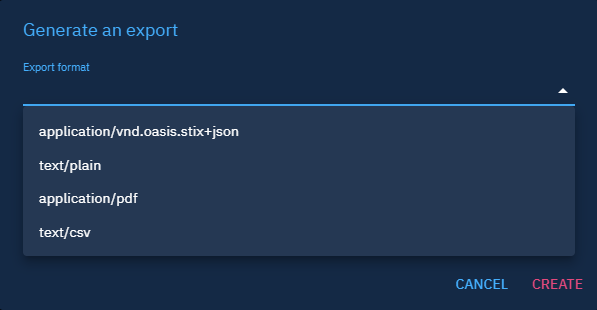 - desired export format (text/csv, application/pdf, application/vnd.oasis.stix+json, text/plain)