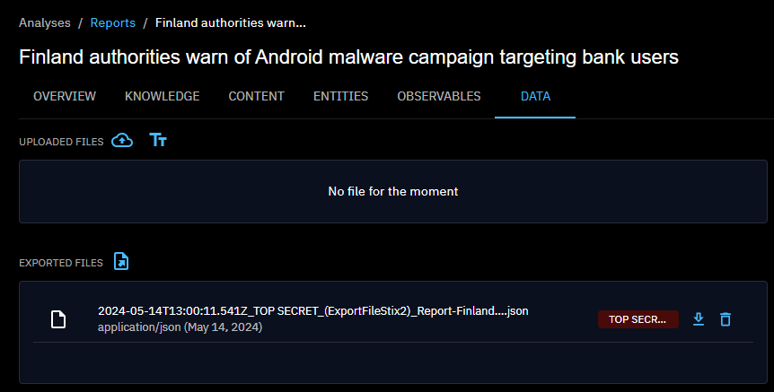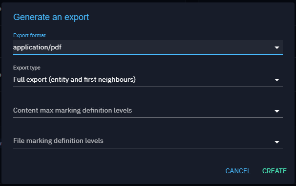 - the file marking definition levels of the export (a TLP level, for instance). This marking on the file itself will then restrain the access to it in accordance with users' marking definition levels. For example, if a file has the marking TLP:RED and INTERNAL, a user will need to have these marking to see and access the file in the platform.```