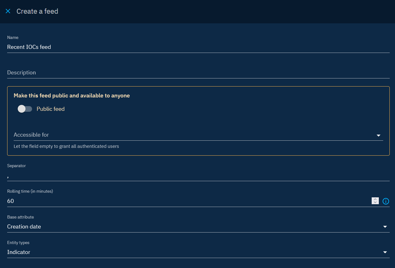 - Filter setup: The feed can have specific filters to publish only a subset of the platform overall knowledge. Any data that meets the criteria established by the user's feed filters will be shared (e.g. specific types of entities, labels, marking definitions, etc.).