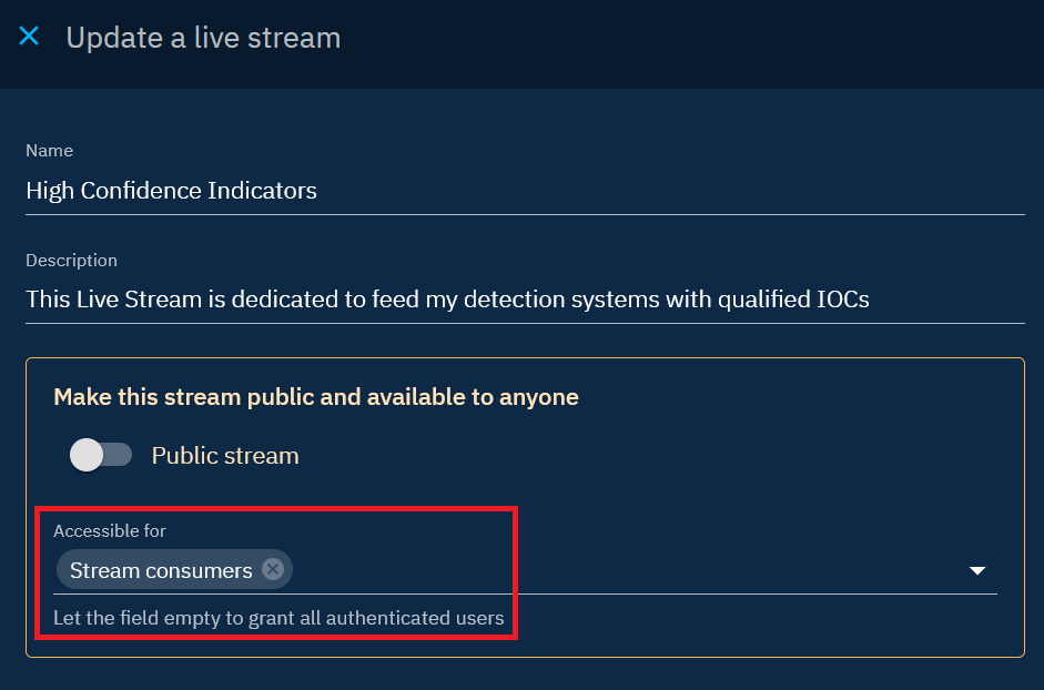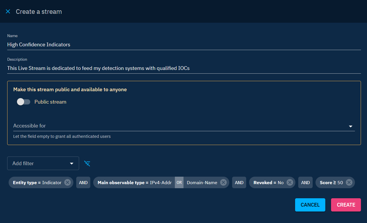 By carefully configuring filters and access controls, you can tailor the behavior of Live streams, TAXII collections, and CSV feeds to align with your specific data-sharing needs.