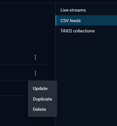 To easily configure a new CSV feed, you can choose to start from an existing feed configuration and duplicate it. The "duplicate" action is accessible from the feed burger menu.