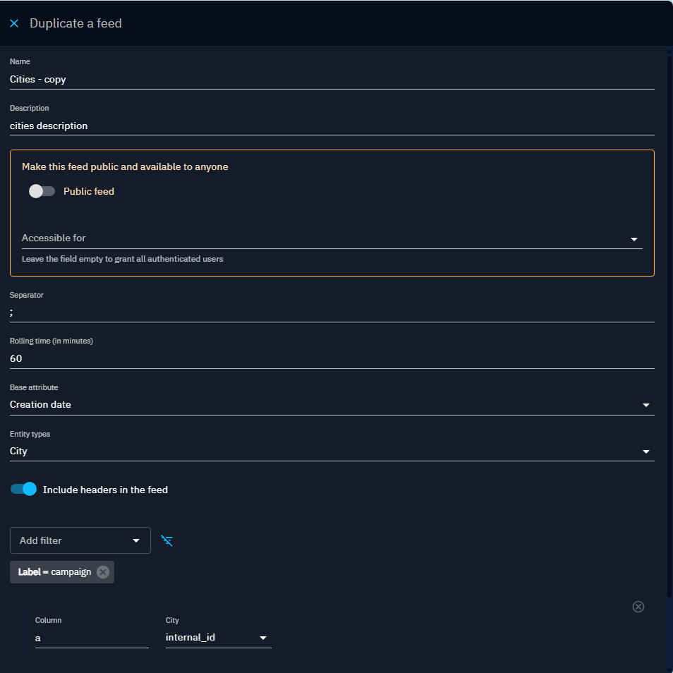 When you duplicate the CSV feed, all fields are copied to the creation form and can be edited. The new feed is named with a "-copy" suffix.