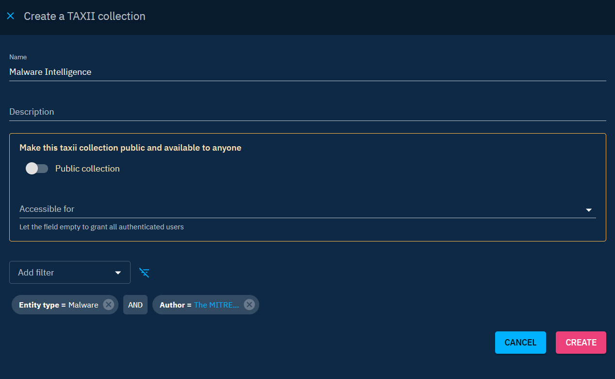 OpenCTI has an embedded TAXII API endpoint which provides valid STIX 2.1 bundles. If you wish to know more about the TAXII standard, please read the official introduction.