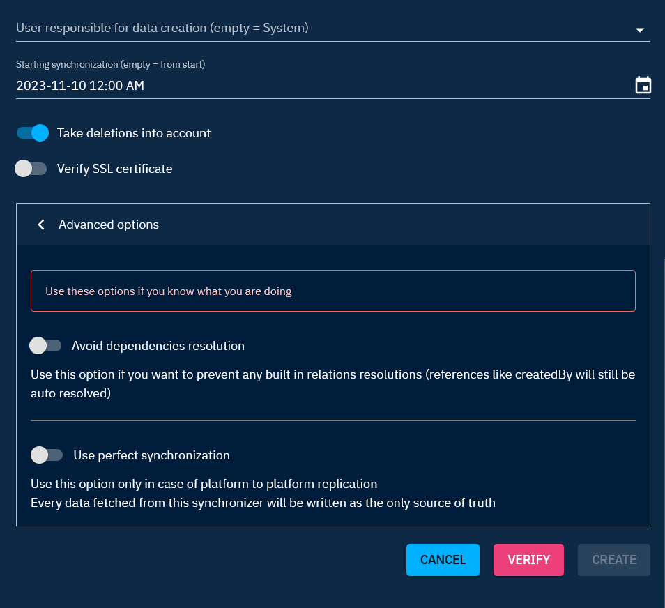 - Use perfect synchronization: This option is specifically for synchronizing two platforms. If an imported entity already exists on the platform, the one from the stream will overwrite it.
