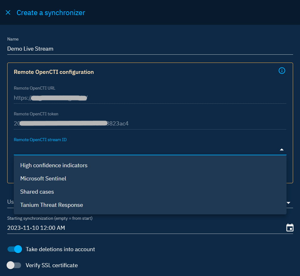 - Remote OpenCTI URL: Provide the URL of the remote OpenCTI platform (e.g.,