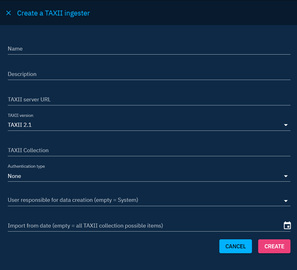 - User responsible for data creation: Define the user responsible for creating data received from this TAXII feed. Best practice is to dedicate one user per source for organizational clarity. Please go to the page for more information.