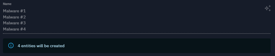 - A modal opens with a textarea input. You can fill multiple lines, each line will be an entity to create. In the example below, we will create four malwares with respectively names: Malware #1, Malware #2, Malware #3 and Malware #4.