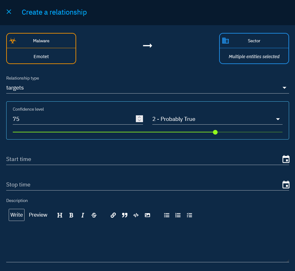 - Fill in the relationship form: As relationships are objects, a creation form similar to creating an entity will appear.