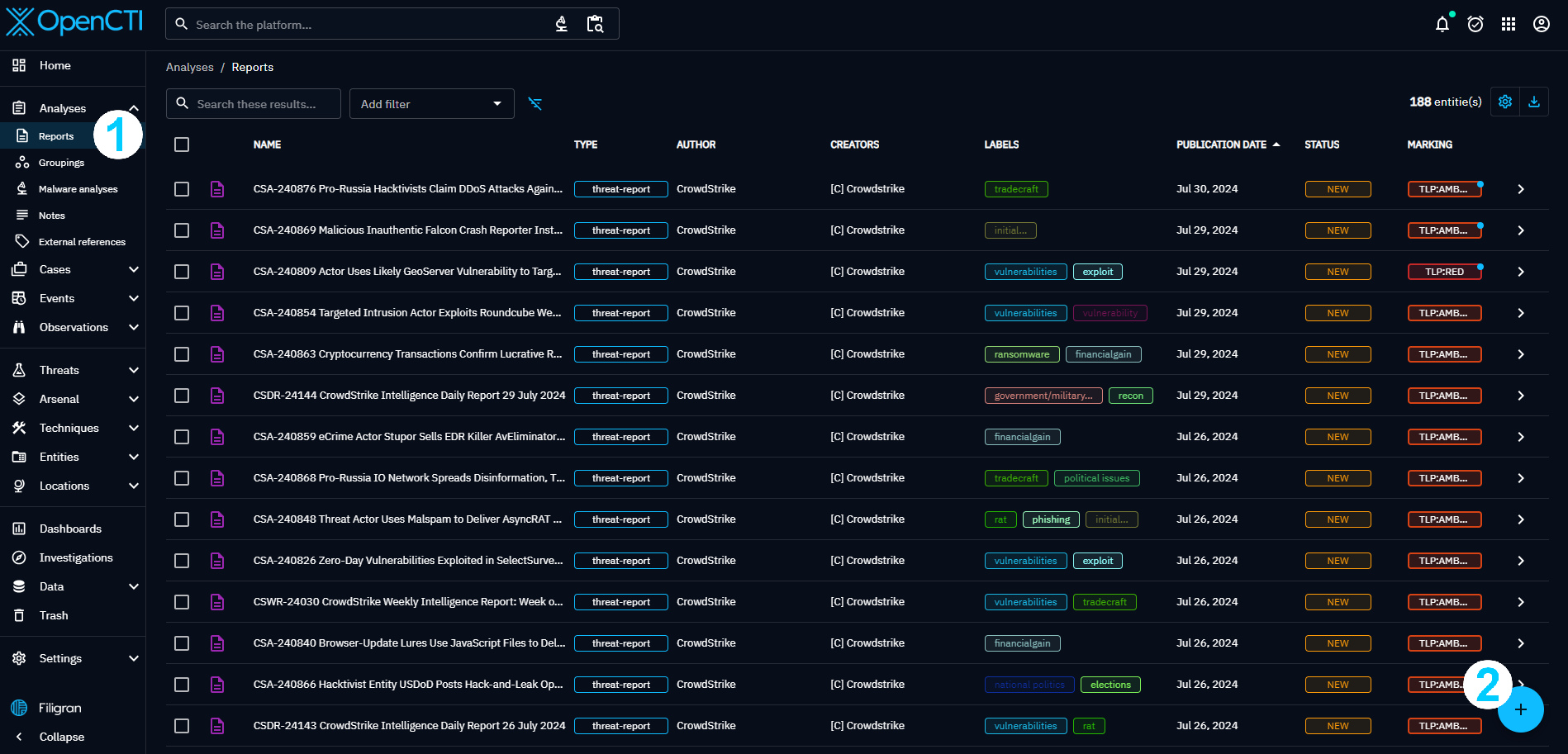 While the aforementioned methods are primary for creating entities and relationships, OpenCTI offers versatility, allowing users to create objects in various locations within the platform. Here's a non-exhaustive list of additional places that facilitate on-the-fly creation: