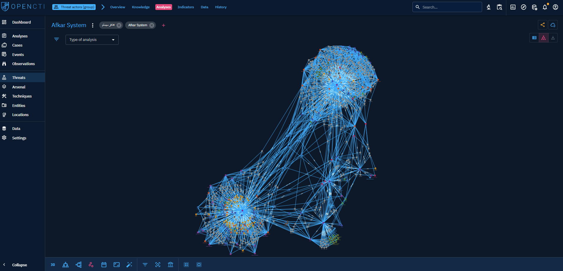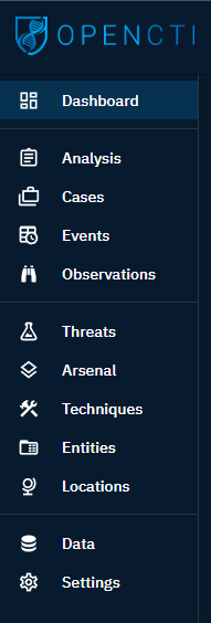 Threats: all threats entities from campaigns to threat actors, including intrusion sets.Arsenal: all tools and pieces of malware used and/or targeted by threats, including vulnerabilities.Techniques: all objects related to tactics and techniques used by threats (TTPs, etc.).Entities: all non-geographical contextual information such as sectors, events, organizations, etc.Locations: all geographical contextual information, from cities to regions, including precise positions.